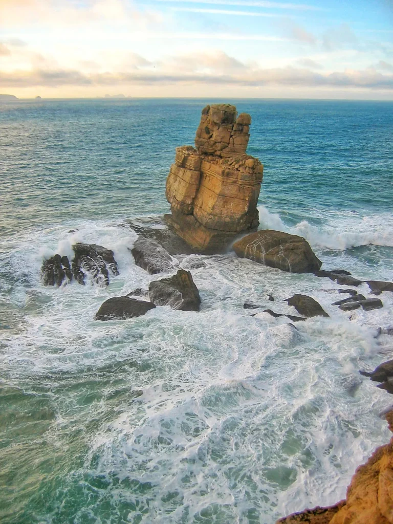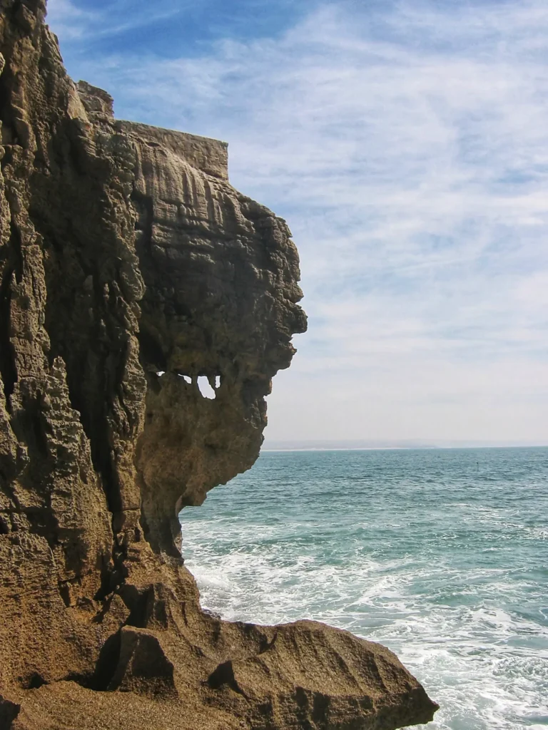 To the west of Peniche and at the tip of the peninsula with the same name, Cape Carvoeiro is an exceptional place for a stroll. On this rocky promontory with particular characteristics, we can see large areas of lapiás (limestone) and other rock formations, created by erosion over many thousands of years. Apart from the lighthouse, its icon is the Nau dos Corvos, a huge rock alone in the water, which resembles a ship heading offshore. On the path to Furninha, south of the Cape, the Furna que Sopra (Blowing Cave) offers a fun and unusual experience. To the north, among the rocks with exotic shapes (one of them resembles an elephant’s head), the Pilatos Balcony is an excellent viewpoint to watch a memorable sunset, with the Berlengas Islands standing out in the distance from the ocean waters.