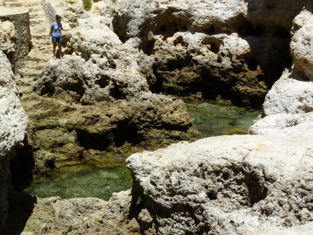 About 750 metres away from the centre of the small town of Carvoeiro, on the road that climbs east along the coast, there is a spectacular rock formation that gave origin to a network of caves flooded by sea water. Access is made via a cemented staircase which takes us to a sort of “indoor pool” surrounded by rocks. The outdoor areas are a favourite place for fishermen and a privileged spot to watch the sea and the coastal shoreline of this part of Algarve. There is a bar with a terrace pleasantly shaded from the sun, and a wooden walkway that also leads to Carvoeiro – a small town which remains one of the most pleasant locations in the western Algarve.