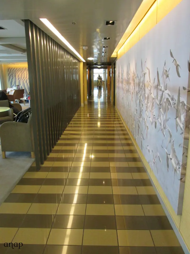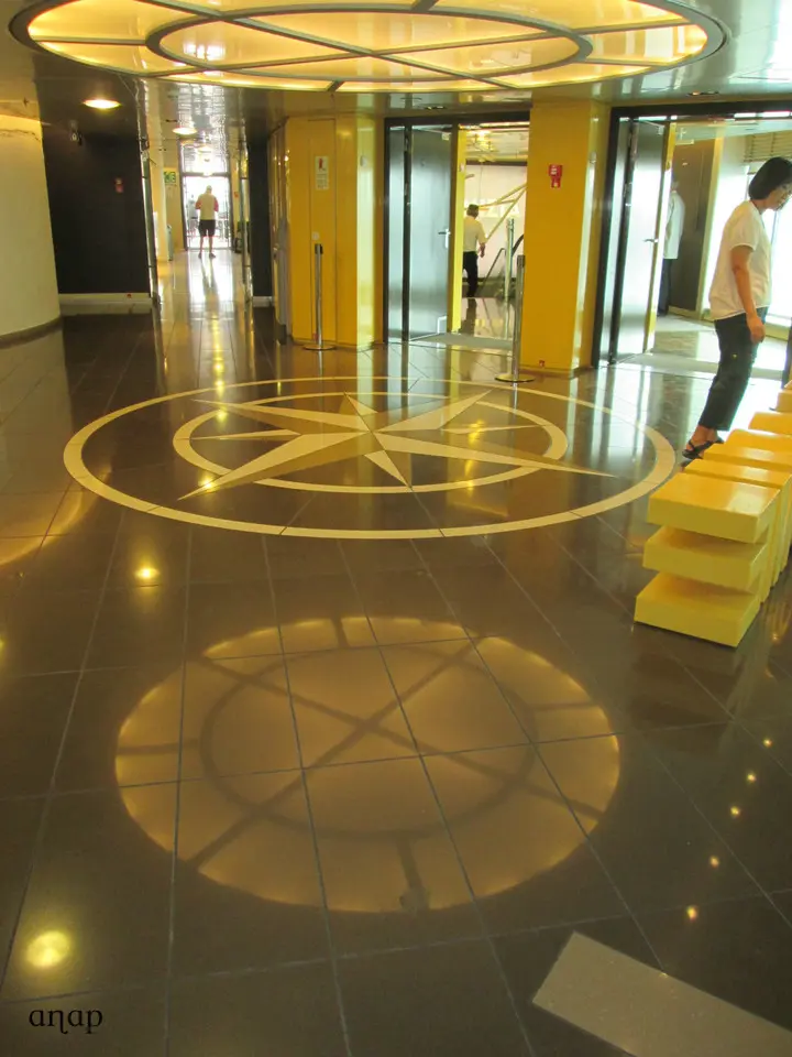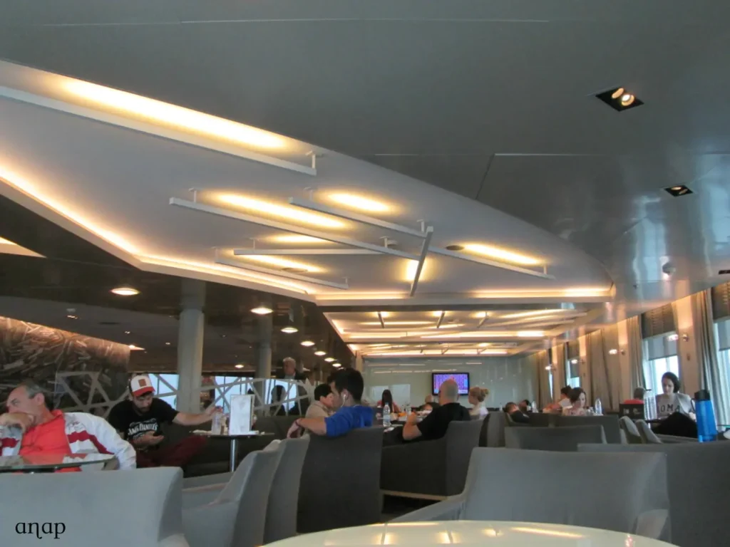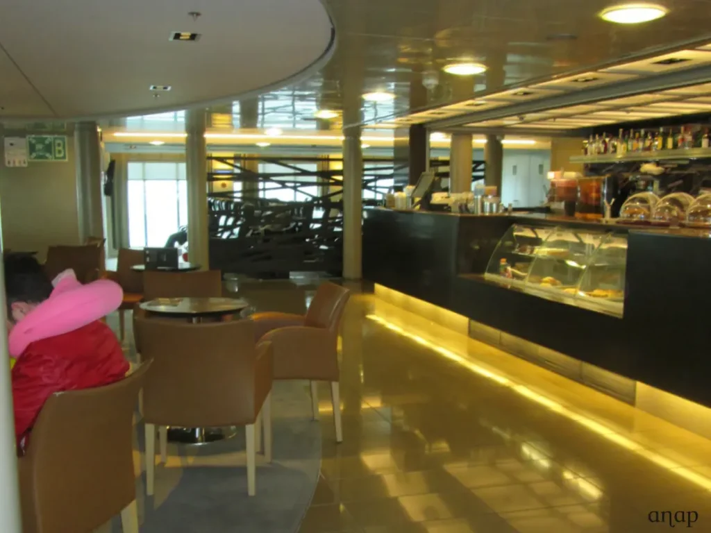 Afinal corre tudo lindamente. O cais de onde sai o ferry é muito perto da estação de Metro e não há filas na bilheteira, por isso dez minutos depois já estamos dentro do barco. Mesmo assim, há bastante gente que madrugou ainda mais do que nós, e muitos dos melhores spots já estão ocupados. O Delos parece mais um navio de cruzeiro do que um simples ferry – na verdade, tem capacidade para 2.400 passageiros e 430 veículos – e tem uma zona de recepção, uma divisão com grandes prateleiras para guardar as bagagens (mas podemos levá-las para o pé de nós, se quisermos), cabines com cama, salas com airseats (sofás individuais e muito confortáveis), e várias salas com pequenos sofás e poltronas dispostos em volta de mesas, tudo rodeado por enormes janelas panorâmicas para podermos apreciar a paisagem. Tem também, obviamente, amplas instalações sanitárias e balcões onde servem vários tipos de comida e bebida, desde um simples café ou um bolo até refeições quentes. Os preços a bordo são um pouco mais caros do que no exterior (a título de exemplo, um donut – gigantesco, note-se! – e um sumo custaram 5,10€), mas não há qualquer tipo de restrição e podemos levar a nossa própria comida para bordo. Existem decks exteriores para quem quer fumar ou apanhar ar fresco, um canil para cães, várias lojas onde comprar revistas ou presentes, máquinas de jogos electrónicos, e tomadas para carregar o telemóvel ou o computador. Também disponibilizam rede wireless de ligação à net, mas lamentavelmente é necessário pagar.