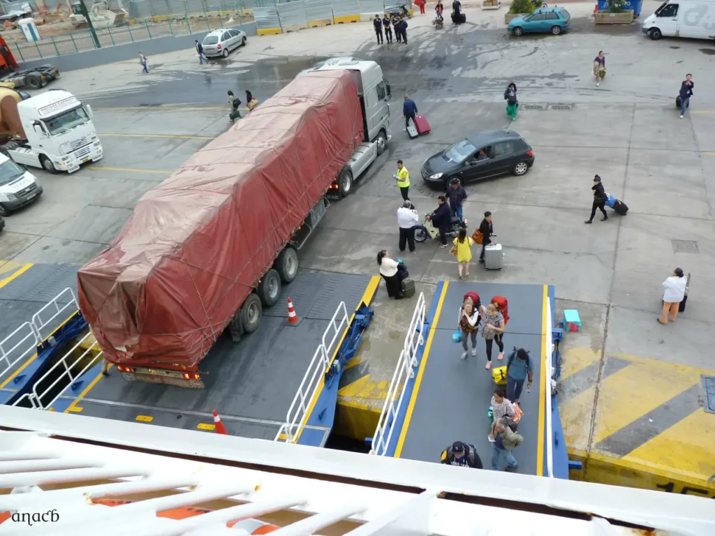 À medida que se aproxima a hora da partida, o movimento no cais vai-se intensificando, sobretudo de carros, carrinhas e camiões, que entram de marcha atrás na enorme garagem para largarem os seus atrelados no interior. Quando chegarem ao seu destino, lá estará outro reboque para os ir recolher. As manobras fazem-se com fluidez e eficiência, sob a supervisão do pessoal do ferry, percebe-se bem que não querem dar margem para atrasos.