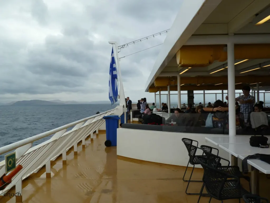 O Delos parte à hora prevista, completamente cheio. O tempo continua desagradável e de vez em quando cai uma chuvada, mas mesmo assim os decks exteriores têm bastante gente. A primeira parte da viagem é a mais aborrecida. São quase 5 horas até à ilha de Paros, a primeira paragem do trajecto, e durante todo esse tempo nada se vê no exterior a não ser uma enorme extensão de água cinzenta, a condizer com a cor do céu. Aproveitamos para passear pelo barco, comer alguma coisa, dormitar, ler e planear o que vamos fazer em Santorini.