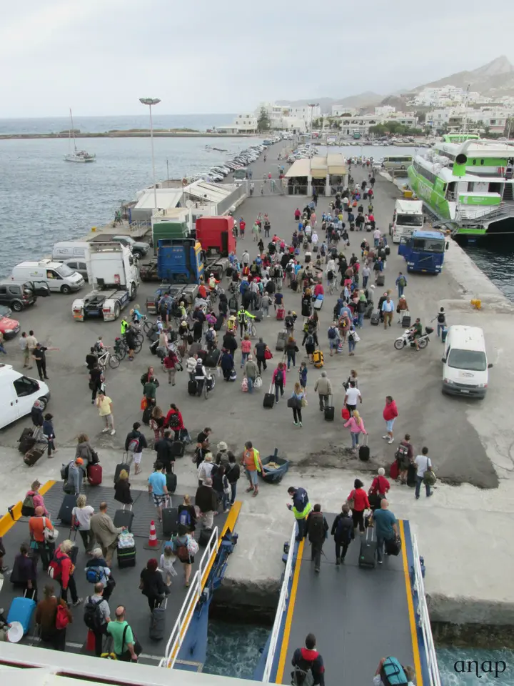 Pouco depois das 10 horas chegamos a Paros. Durante mais ou menos 20 minutos repete-se no cais a azáfama de saídas e entradas, embora em menor escala. Já não chove, por isso o deck traseiro está cheio de gente como nós, a observar e a tirar fotografias, para quebrar a monotonia da viagem. A cena volta a repetir-se cerca de meia hora depois, quando o barco pára em Naxos. O ambiente modorrento das primeiras horas da viagem desapareceu, e já se sente no ar a excitação de estarmos perto do nosso destino.