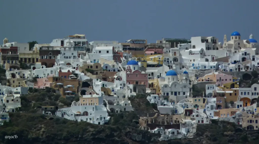 Manobras de atracagem concluídas, deixamos o Delos por volta das 4 e um quarto da tarde. Sopra um vento frescote, mas não chove e o sol brilha entre as nuvens já esparsas. Junto ao cais de Athinios acumulam-se carros, táxis e autocarros com destino a praticamente todas as localidades da ilha, prontinhos para levar as muitas centenas de pessoas que estão a desembarcar. No meio da confusão lá conseguimos descobrir um autocarro para Oía, que tem paragem em Firostefani perto do pequeno hotel onde vamos ficar. A viagem custa 3,80€ – se fosse até Fira seria um pouco menos, mas Firostefani fica cerca de 1,5 km depois e a estrada é sempre a subir. Mesmo apenas levando uma mala pequena e uma mochila, depois de tantas horas de viagem não nos apetece nada fazer aquele bocado de caminho a pé.