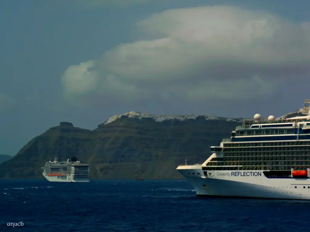 Um pouco mais à frente repete-se a paisagem, à medida que vão deslizando ante o nosso olhar, no topo das enormes falésias, as localidades de Imerovigli, Firostefani e por fim Fira, a capital. No nosso percurso final até ao porto, cruzamo-nos com alguns navios de cruzeiro, enormes como arranha-céus, já de partida para outras ilhas, outros ainda parados a aguardar o regresso dos passageiros.