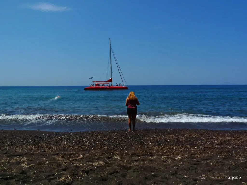 Em alternativa, é possível apanhar um dos pequenos barcos que saem regularmente do porto de Akrotiri e nos deixam mesmo na praia – mas aqui há que prever que a descida do barco será feita directamente para a água, com a consequente molha, pois não existe nenhum cais. Os mesmos barquitos podem levar-nos até à praia branca, uma língua de areia escura rodeada de grandes rochedos brancos localizada logo a seguir à praia vermelha. Aconselhável para quem gosta de passeios de barco.