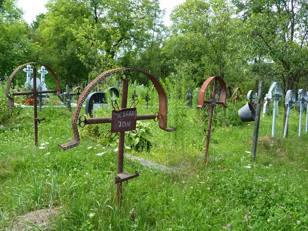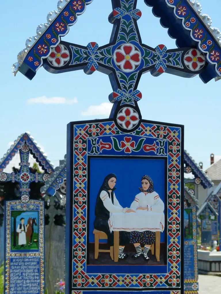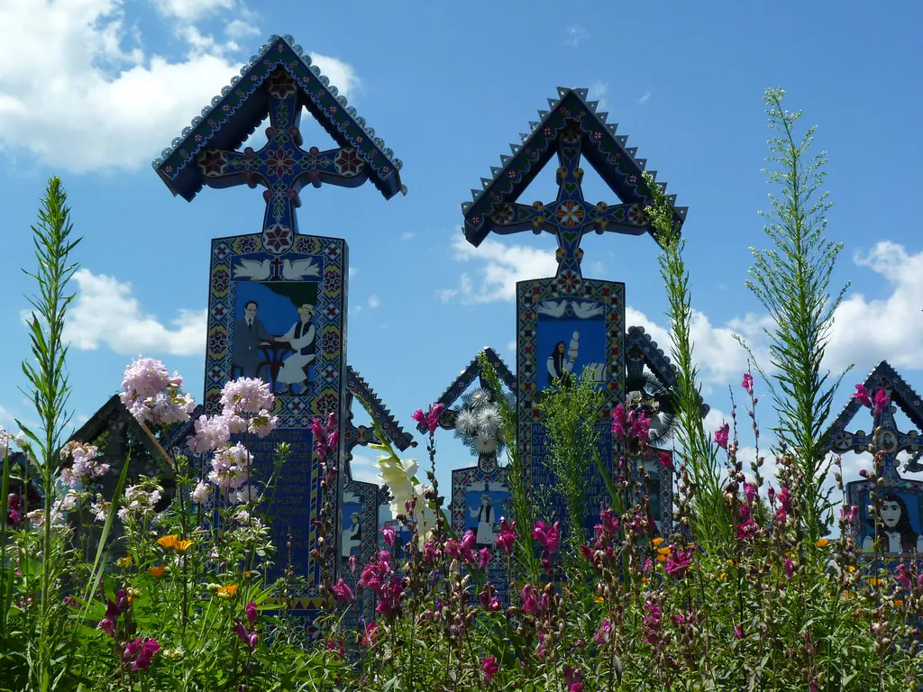 Este cemitério é um lugar único, que celebra as vidas das pessoas que ali estão enterradas em vez de chorar a sua morte. As lindíssimas cruzes de madeira que assinalam cada sepultura, esculpidas e pintadas em azul forte (conhecido como azul Săpânţa) e outras cores igualmente chamativas, num estilo naif, ilustram cenas que caracterizam a pessoa que morreu ou a forma como morreu, em conjunto com uma descrição divertida ou um poema. Stan Ioan Pătraş foi o artista local que deu origem a esta tradição e até à sua morte, em 1977, produziu quase 700 destas cruzes. Como não podia deixar de ser, é neste cemitério que se encontra sepultado, precisamente à frente da porta da igreja, com a sua imagem encimada por duas pombas brancas. A obra de Pătraş tem sido desde essa altura continuada pelos seus aprendizes.