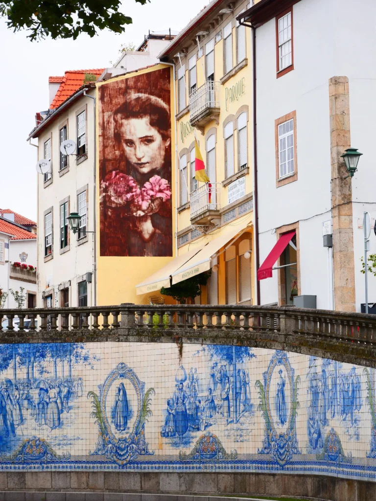 Do outro lado da Praça, o painel de azulejos criado em 1931 pelo pintor portuense Joaquim Lopes guia-nos até ao pequeno Jardim das Mães, e ao lado da Pensão Rossio Parque há uma reinterpretação gigante, pintada pelo artista urbano Ricardo Romero, do quadro “Menina das Camélias” de José Almeida e Silva – uma obra que faz parte do acervo do Museu Grão Vasco.