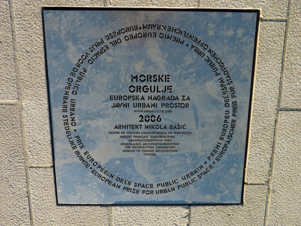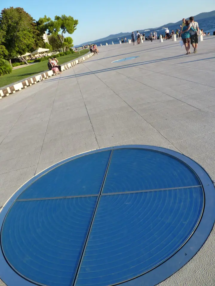 É na ponta noroeste da Riva que está uma das duas mais modernas atracções de Zadar, e a razão principal que me tinha levado a incluir a cidade na nossa viagem pela Croácia: o Órgão do Mar (Morske Orgulje, em croata). Concebido em 2005 pelo arquitecto Nikola Bašić, devidamente assessorado por vários peritos, poderia à primeira vista passar por uns simples degraus de mármore que descem até à água, como que em prolongamento da linha costeira. Poderia… não fossem dois “pequenos” pormenores. O primeiro é obviamente o som. Começamos a ouvi-lo ainda longe, uma espécie de melodia rouca que vai subindo de tom à medida que nos aproximamos. Sob aqueles 70 metros de degraus largos de aspecto inofensivo esconde-se uma interessante obra de engenharia: os degraus inferiores deixam entrar água e ar, que é encaminhado para câmaras de ressonância – 35 tubos de diferentes comprimentos, diâmetros e inclinações, orientados verticalmente em relação à costa, terminando numa espécie de corredor, cada tubo munido de apitos que reproduzem 7 acordes de 5 tons – e depois empurrado pela água novamente para o exterior através de orifícios talhados na parte superior das escadas. Os sons produzidos são meio irreais e absolutamente hipnóticos, convidando à contemplação e à tranquilidade. Como a ondulação do mar está constantemente em mudança, a melodia produzida pelo órgão nunca é exactamente a mesma e cada conjunto de sons é único e virtualmente irrepetível.