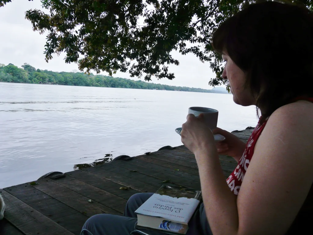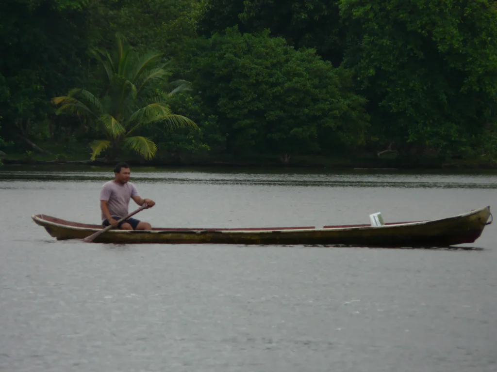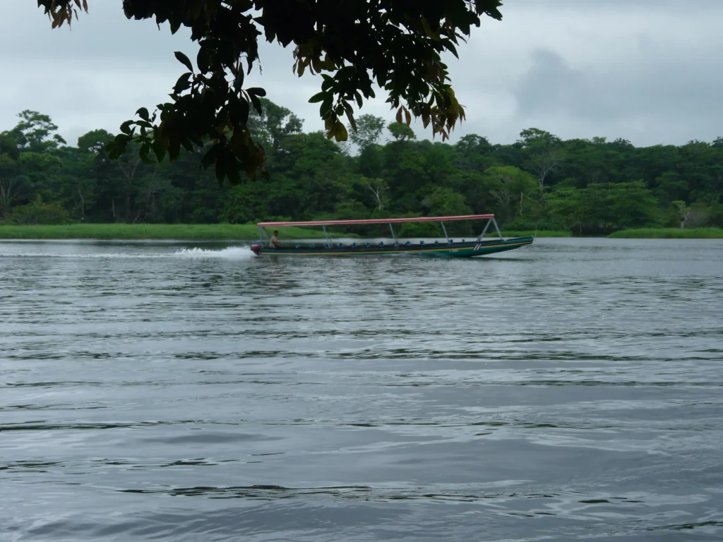 Aproveitámos também para olhar uma última vez a lindíssima paisagem da lagoa, mas fomos interrompidos pelas exclamações de entusiasmo de um homem, provavelmente um habitante local, que do alpendre da casa ao lado nos apontava algo que boiava ao sabor da corrente. Aos nossos leigos olhos de europeus habitantes de uma cidade, parecia um tronco ou um detrito qualquer. “Un perezoso!”, informou-nos. E só então percebemos que se tratava de uma preguiça, boiando de costas e deixando-se levar pela corrente para se deslocar de um lado para o outro. Estava um pouco longe e não conseguimos vê-la bem, mas descobrir que um animal supostamente tão calmo e que passa a vida nas árvores pode deslocar-se na água e, mais ainda, ter inteligência suficiente para aproveitar a corrente a seu favor, foi na verdade uma surpresa. Uma das muitas que ainda estavam para vir.