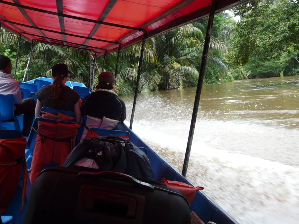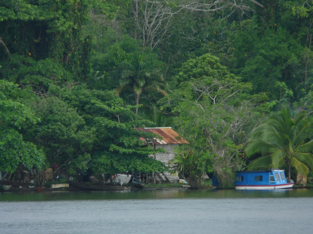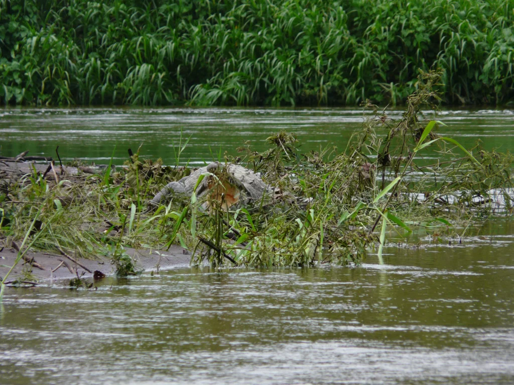 O barco em que saímos de Tortuguero dirigiu-se para “La Geest”, uma plantação de bananas explorada por holandeses. Além de nós, apenas um casal de turistas alemães com uma mala enorme, que fazia as nossas parecerem simples mochilas, e alguns habitantes locais que transportavam compras e foram desembarcando ao longo do trajecto de pouco mais de uma hora. O canal era diferente daquele por onde tínhamos chegado, mais largo e com vegetação menos densa. A embarcação ruidosa foi dobrando curva após curva, o condutor evitando os ramos de árvores à deriva com a destreza de quem está familiarizado com o percurso, e para nossa emoção a passagem veloz do barco arrancou mais do que uma vez um ou outro caimão do seu descanso na margem, fazendo-o esconder-se dentro de água.