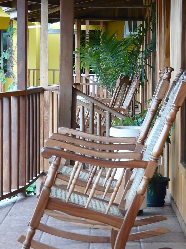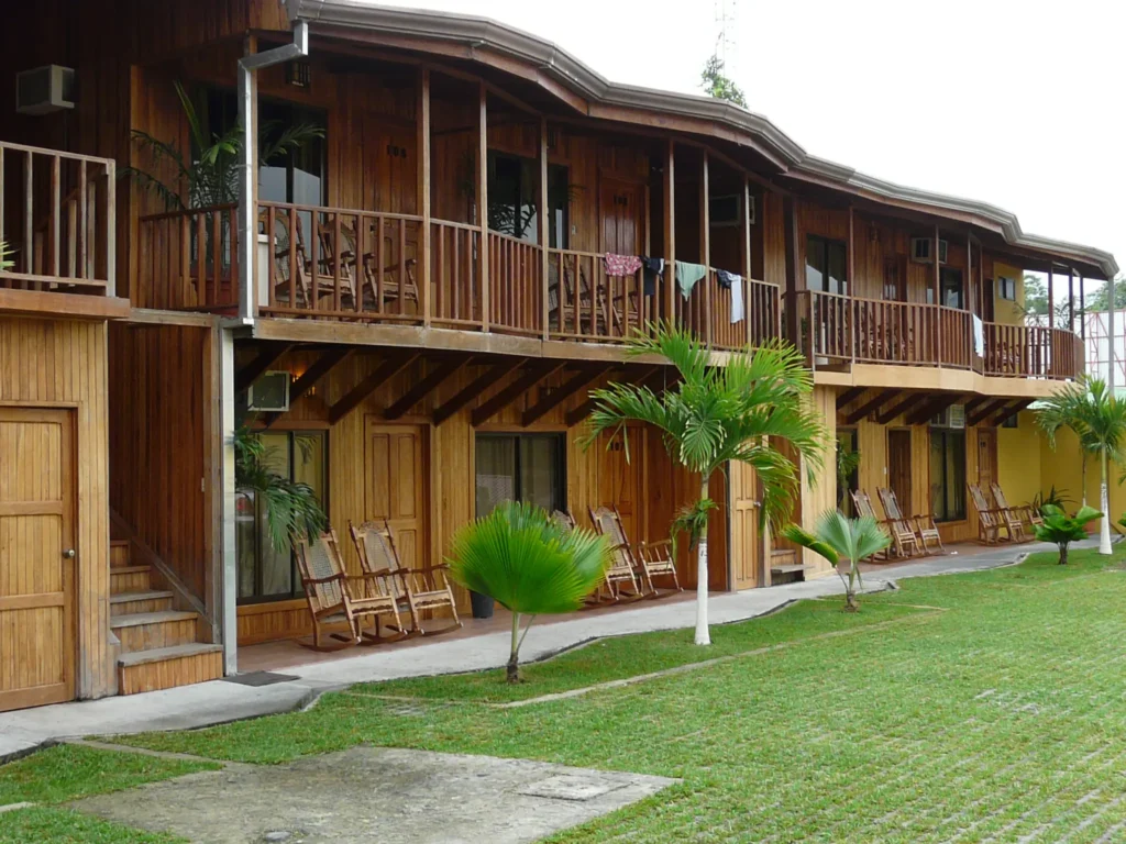 O hotel fica situado em frente ao jardim, mesmo no centro de La Fortuna. É um edifício sobrecomprido com apenas dois pisos, exteriormente forrado de madeira, que lhe dá um aspecto rústico e acolhedor. Tem parque de estacionamento privado e o acesso às habitações é feito pelas varandas, também em madeira. Os quartos são simples mas muito espaçosos, têm duas camas grandes e uma kitchenette, televisão e ar condicionado. Sem excepção, todos os hotéis e albergues em que ficámos nesta viagem, independentemente da categoria, não tinham banheira mas sim uma box (geralmente grande) com chuveiro.