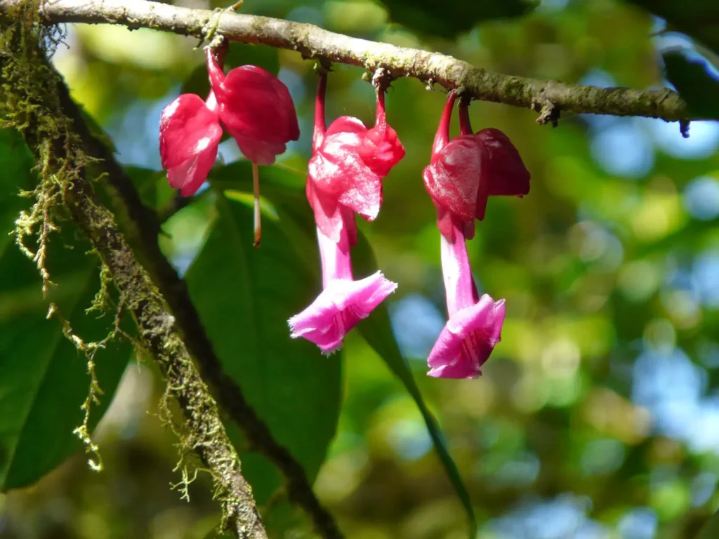 As nuvens que envolvem a floresta nebulosa de Monteverde depositam água sobre as folhas e troncos e permitem a proliferação das plantas epífitas, ou seja, plantas que crescem sobre outras, sendo estas últimas geralmente árvores. Ao contrário das plantas parasitas, que se alimentam da hospedeira, as epífitas alimentam-se da água e dos nutrientes que a omnipresente neblina transporta e nela deposita. Em Monteverde há pelo menos 878 espécies de epífitas, e grande parte das orquídeas e bromeliáceas que vimos são deste tipo. Das mais de 1400 variedades de orquídeas que crescem na Costa Rica, cerca de 500 são encontradas em Monteverde e entre elas contam-se as mais pequenas do mundo. O Diego mostrou-nos ainda as botellitas (“garrafinhas”), umas florinhas cor-de-rosa agrupadas em cachos e cuja forma faz jus ao nome, e as lábios-de-noiva (que também são chamadas de lábios-de-p—), de um vermelho escuro sugestivo.