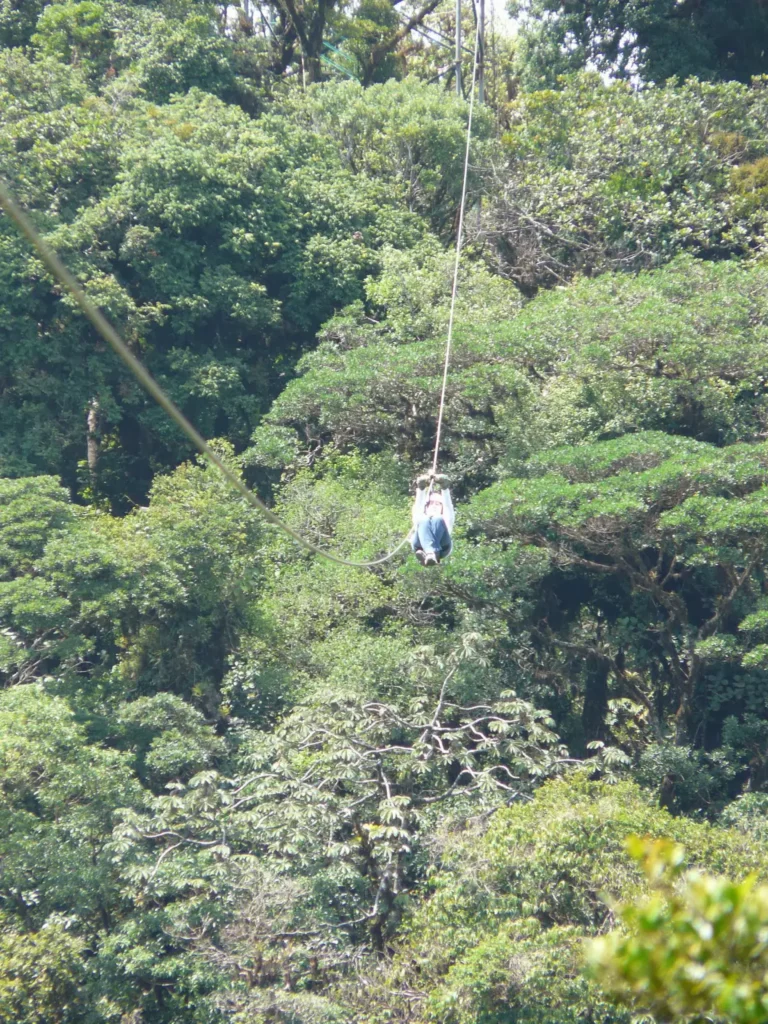 As linhas vão alternando por vezes com curtos trajectos a pé. No início do percurso 7, o mais alto de todos, existe uma torre de observação à qual é necessário trepar. De lá tem-se uma vista fabulosa sobre a floresta. A altura impõe respeito, e os 450 metros de comprimento do cabo também. Mas o ponto mais complicado é a linha 10, com os seus 770 metros de extensão. Colocada a 100 metros de altura, muito acima da vegetação, encontra-se num local particularmente ventoso, o que provoca grandes oscilações no cabo e a consequente dificuldade da poleia em deslizar. Depois de alguns dos elementos do grupo terem atravessado sem dificuldades de maior, ao chegar a minha vez a brisa tinha aumentado de intensidade. A meio do percurso comecei a perder velocidade, até que por fim parei completamente, ainda a uma distância razoável do fim da linha. E ali fiquei eu, suspensa pelas ancas uma centena de metros acima do solo, um simples arnês a ligar-me a um cabo de aço. Tentei não olhar para baixo, mas era virtualmente impossível não me sentir vulnerável naquela situação, e a adrenalina fez o meu coração disparar. Valeu-me o sangue frio e também as instruções do Jason, e lá me virei ao contrário e fiz o resto do percurso impulsionando-me com as mãos no cabo. Dois outros elementos do grupo tiveram também de passar pelo mesmo, até que por fim o vento abrandou.
