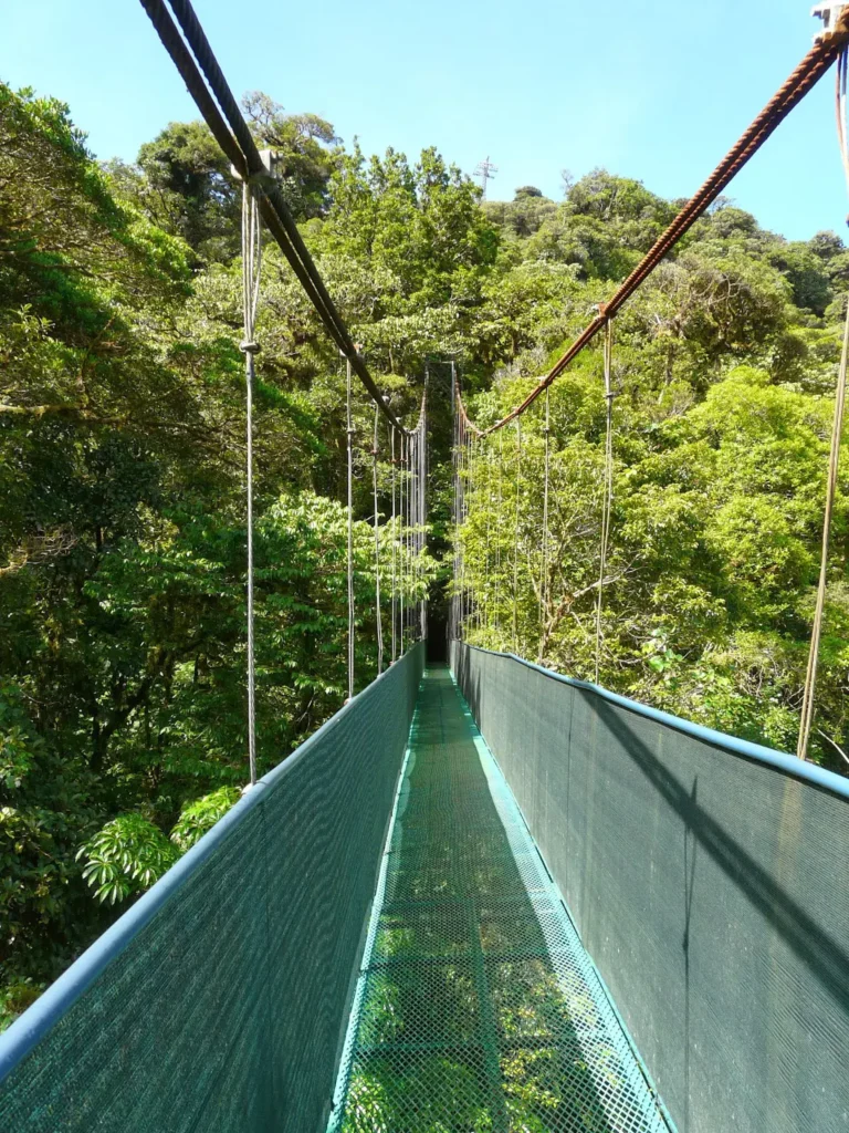 A visita começou por um percurso de 2,5 km a pé através da floresta, para observarmos a fauna e a flora típicas, a que dão o nome de SkyWalk. Alternando com caminhos de terra batida, um sistema de 5 pontes suspensas sobre o “copado” brinda-nos com perspectivas singulares do bosque, só aconselháveis a quem não tenha vertigens. A ponte mais longa tem 300 metros de comprimento, e a mais alta está situada a 49 metros do chão. São pontes metálicas suspensas de cabos de aço, em que o piso é uma rede metálica através da qual vemos a vegetação que cresce lá em baixo, por vezes mesmo muito lá em baixo, uma espécie de colchão verde que ondula ao sabor da brisa constante.