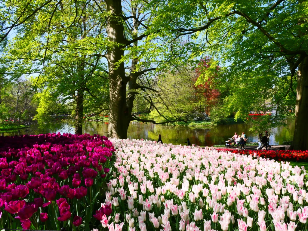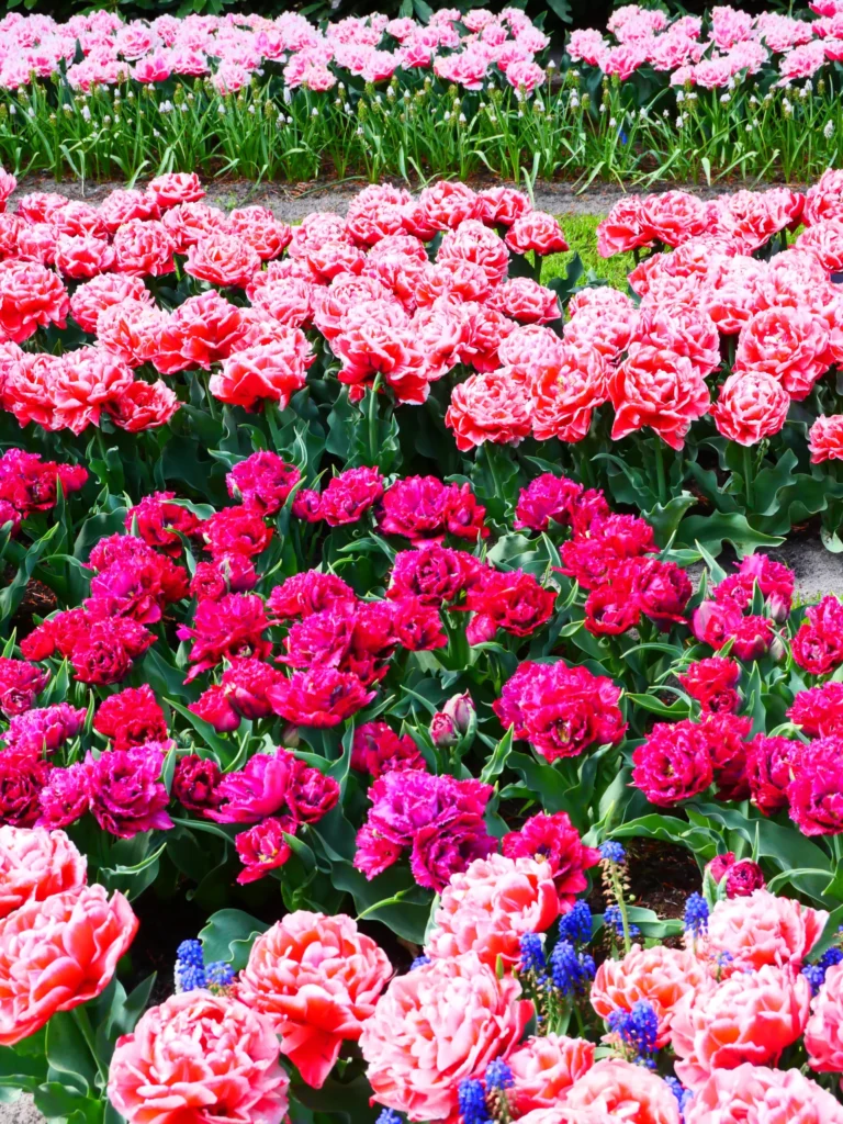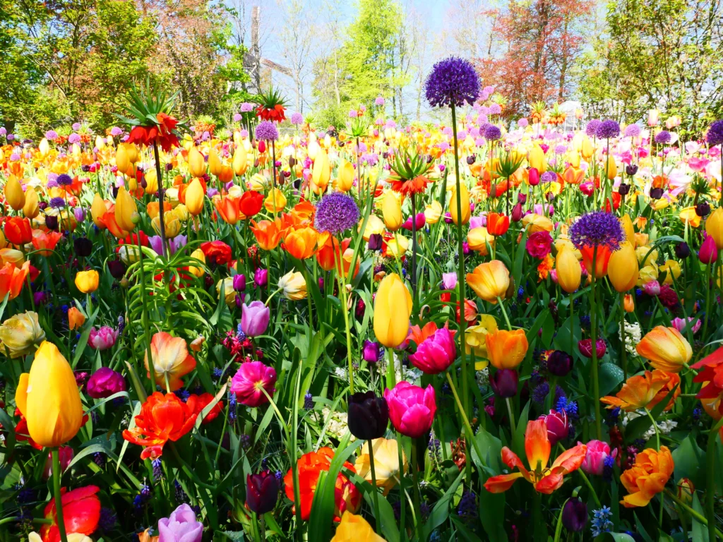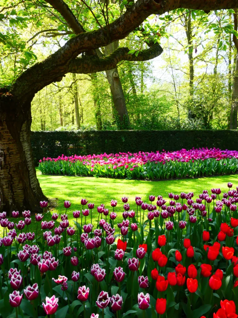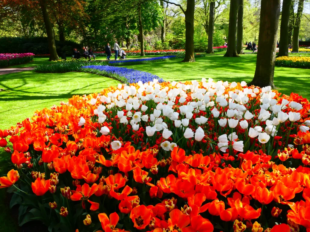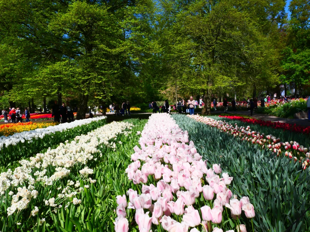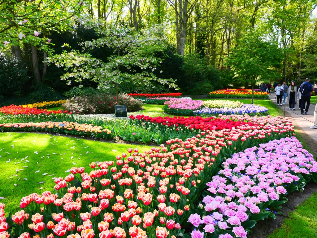 Entre as variedades mais conhecidas que é possível encontrar em Keukenhof destacam-se a “Queen of Night”, de tom quase negro e muito elegante; a “Apeldoorn”, vermelha intensa e clássica; a “Golden Apeldoorn”, de amarelo luminoso; a “Angelique”, de pétalas dobradas com aspecto semelhante ao de uma peónia; a “Parrot Tulip”, com pétalas recortadas e cores exuberantes; e a “Rembrandt”, marcada por padrões irregulares que evocam as antigas tulipas do período histórico da tulipomania.