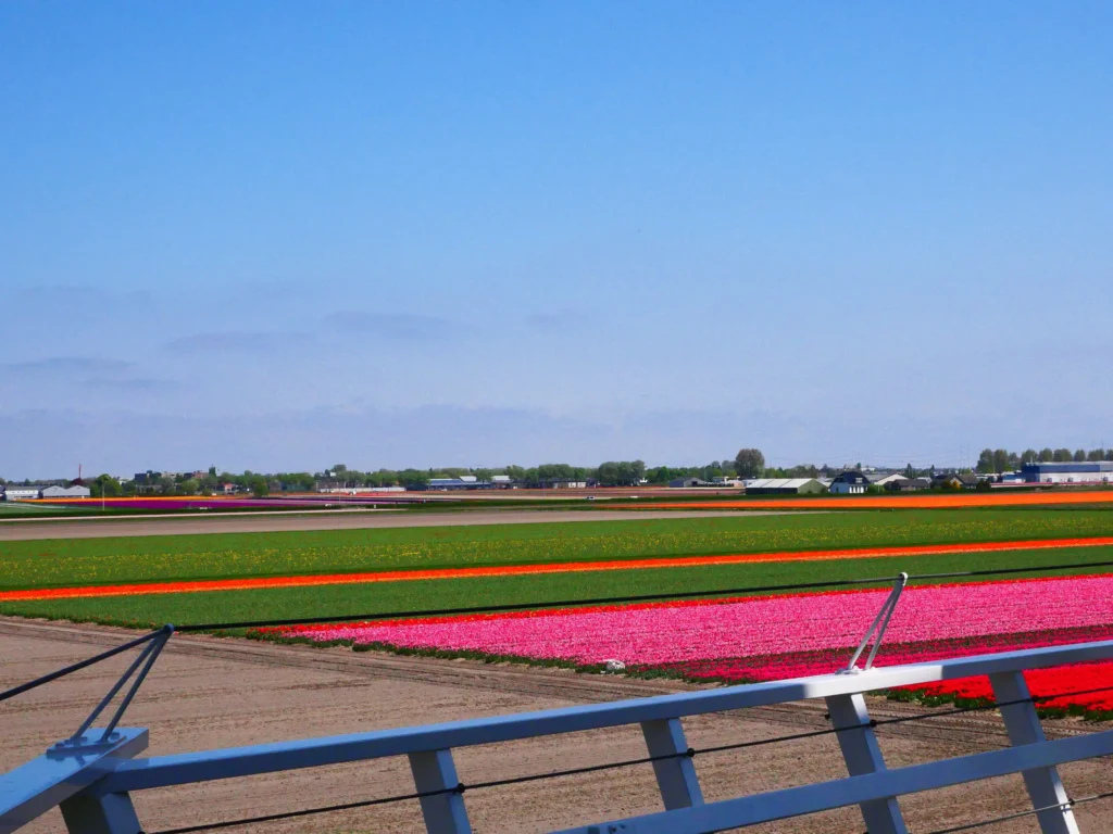 No centro da propriedade onde está instalado o Keukenhof destaca-se um moinho tradicional neerlandês. Não é apenas um elemento decorativo. Funciona como ponto de observação privilegiado e estabelece continuidade visual entre o jardim ornamental e os campos agrícolas circundantes. Da sua varanda, torna-se evidente a escala da produção regional e a interdependência entre harmonia paisagística e actividade económica.