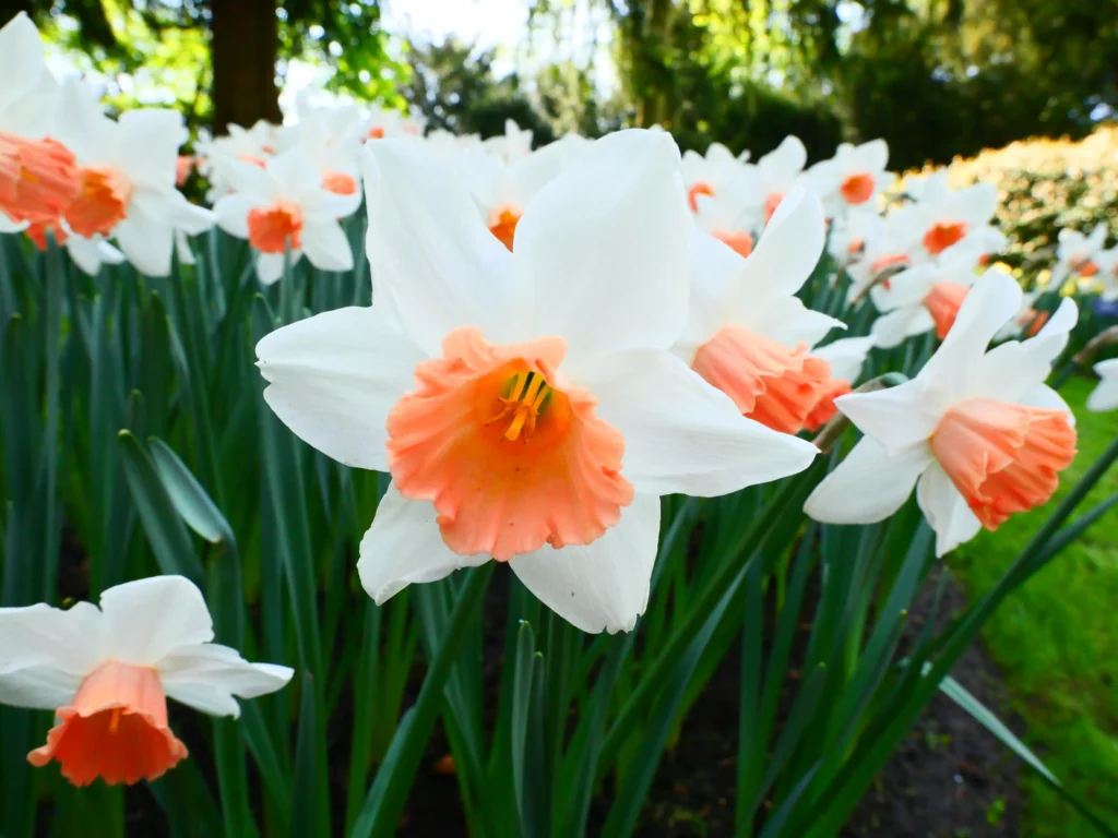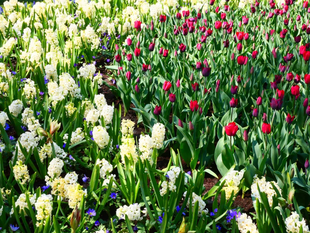 Além das tulipas, o parque exibe jacintos intensamente perfumados, narcisos de tonalidades variadas, lírios elegantes e outras espécies bolbosas que permitem escalonar a floração ao longo das semanas.