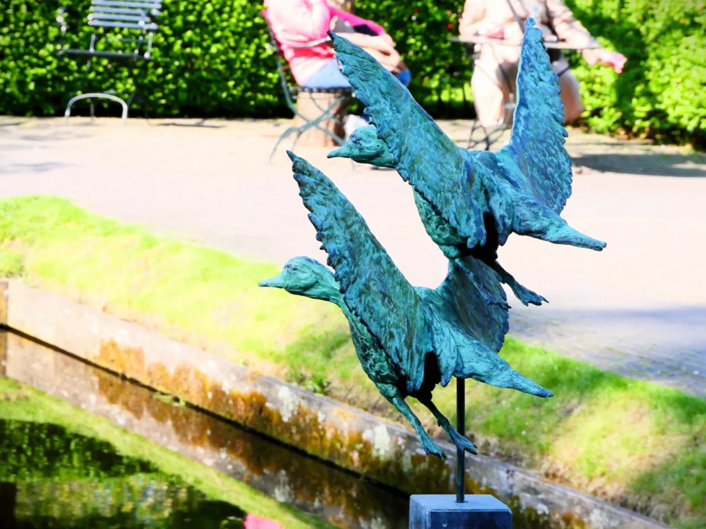 Esculturas contemporâneas surgem pontualmente entre maciços florais, lagos e clareiras arborizadas, como interrupções discretas no domínio vegetal. Não procuram rivalizar com a intensidade cromática das flores nem impor-se como elemento principal; antes funcionam como pausas visuais, pontos de ancoragem que nos levam a fazer uma pausa e focar a atenção. A sua presença, muitas vezes silenciosa, cria um contraste produtivo entre matéria inerte e matéria viva, entre forma estável e forma em mudança.