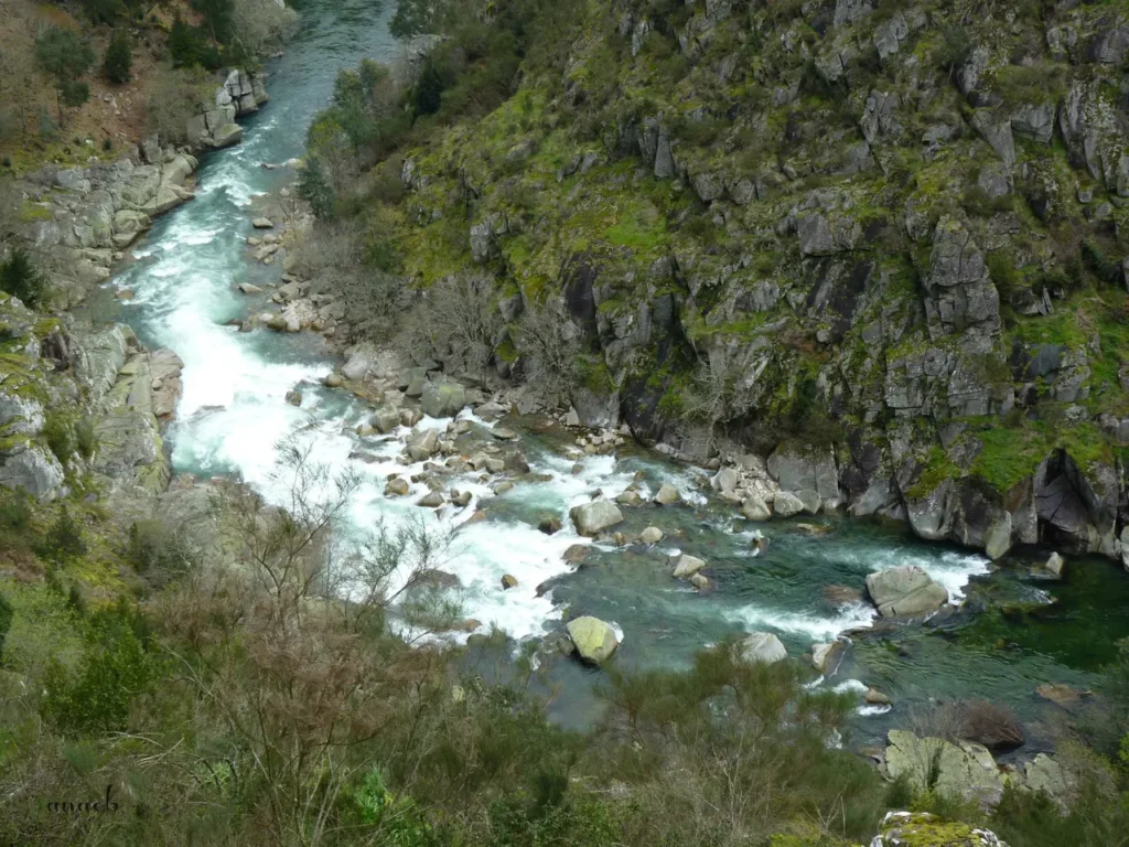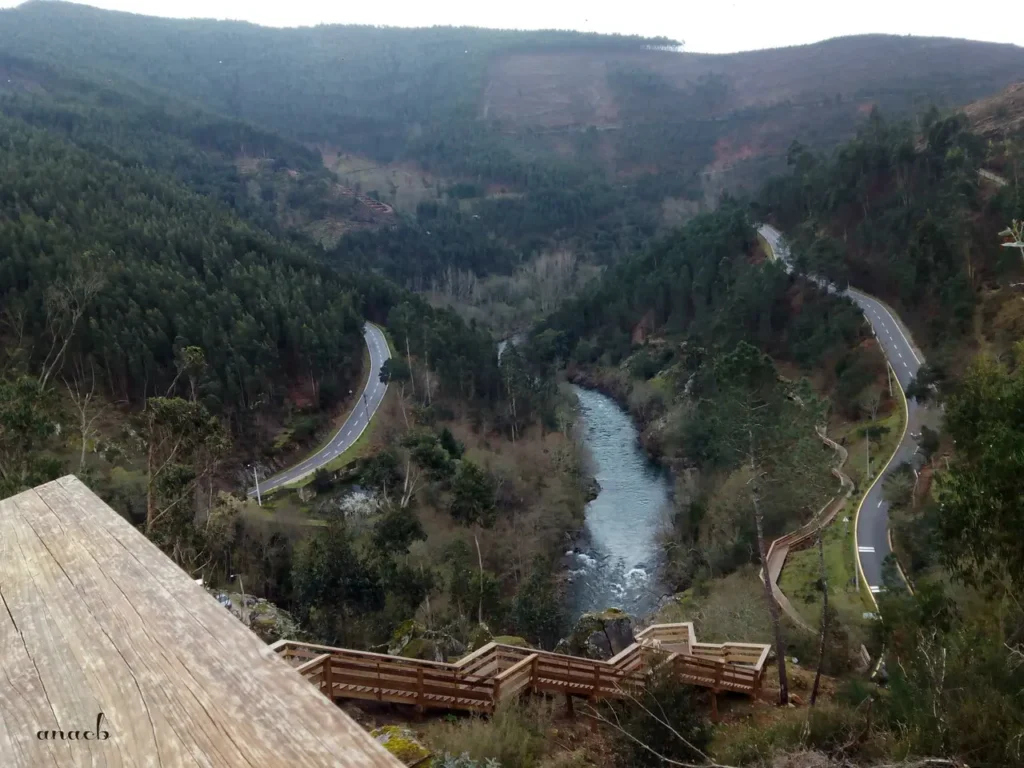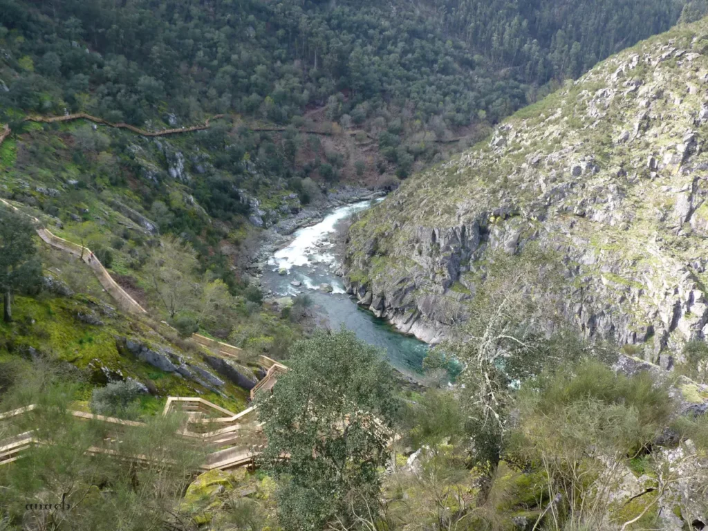 Mais à frente, percorridos já cerca de 6,5 km, o miradouro sobre o Salto do Paiva é local privilegiado para observar aquele que é considerado o ponto mais perigoso do rio – e certamente também o mais impressionante, com a água revolta e branca de espuma precipitando-se entre as rochas negras.