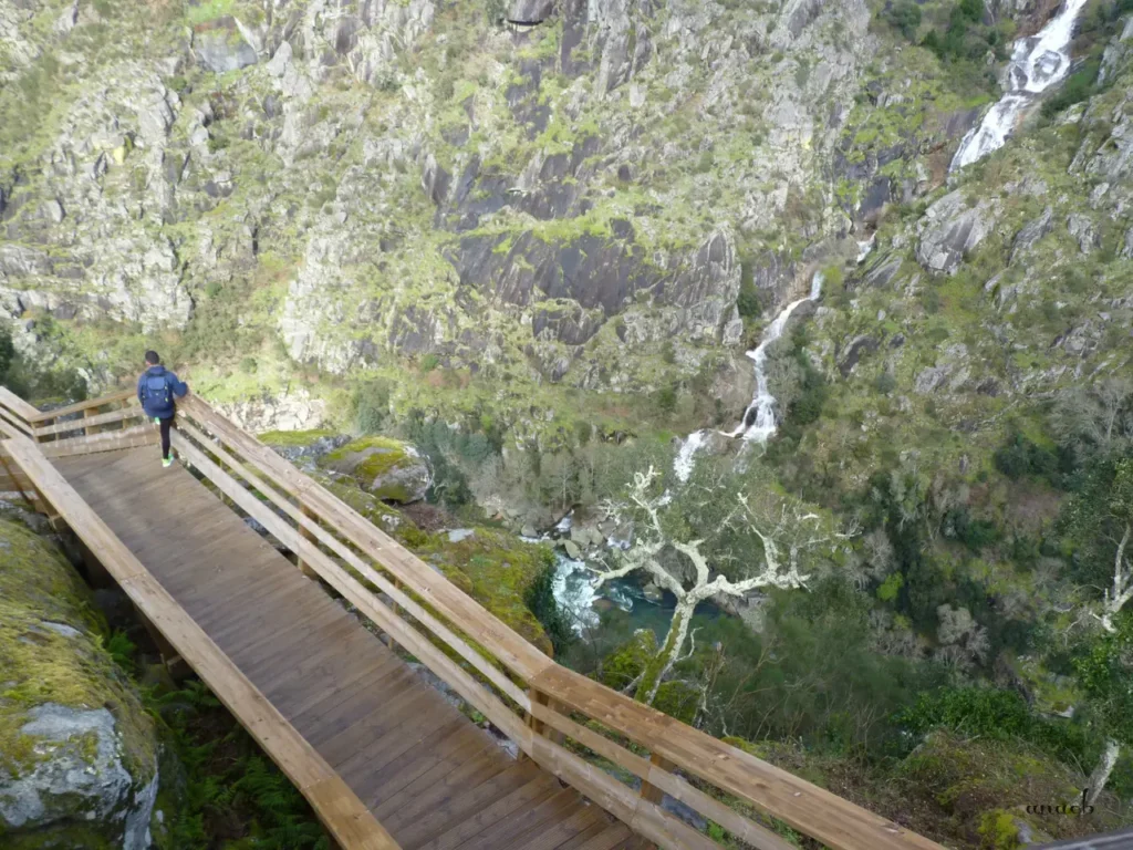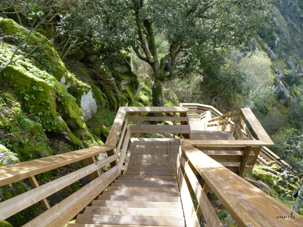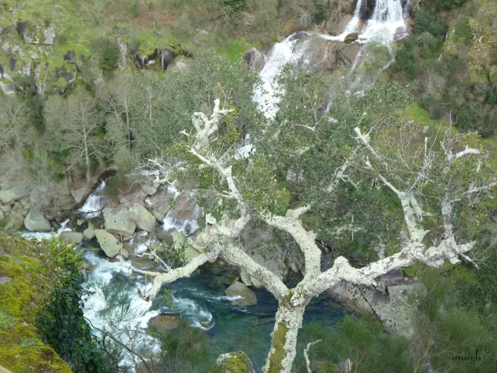 O percurso continua depois num pequeno troço de terra batida, também a subir, até chegarmos ao posto de controlo dos bilhetes. A paragem seguinte é no miradouro da Cascata das Aguieiras, mas aqui o que nos faz perder o fôlego é a paisagem que nos rodeia quase completamente, com as águas brancas da cascata a escorrerem em socalcos pela encosta rochosa do outro lado do rio.