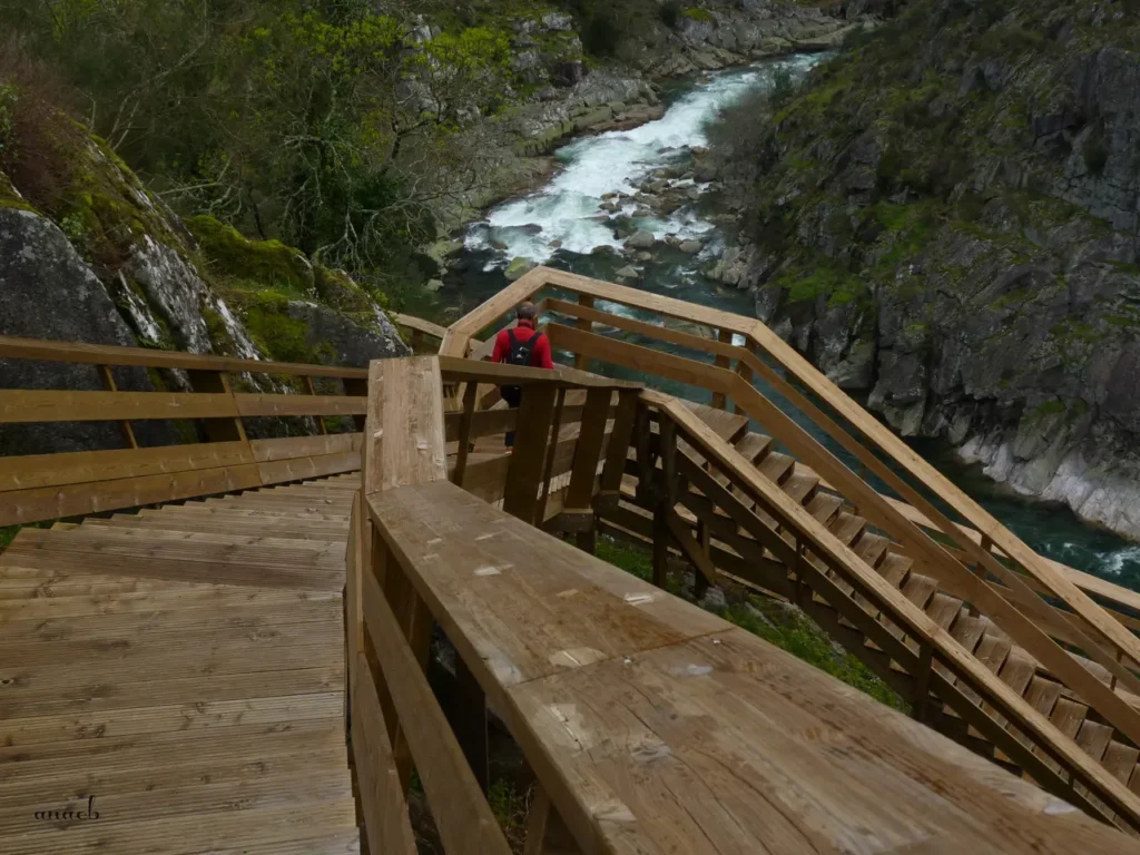 Começa aqui a descida mais extensa, com o passadiço a ziguezaguear pela vertente abaixo, degrau após degrau. Cruzamo-nos com quem está quase a terminar o percurso no sentido inverso, na sua maioria pessoas com ar de quem não está a achar fácil a experiência. O passadiço de madeira continua depois a estender-se pela encosta, um pouco acima do rio, até se perder de vista numa curva do caminho, lá muito à frente.