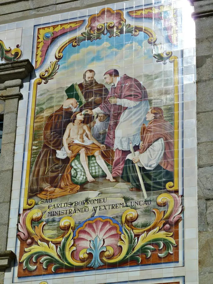 The interior is likewise striking, with its vaulted ceiling made of exotic wood and the walls decorated with marble stripes and large panels of tiles painted with figures and scenes framed by elaborate borders. The baptismal font is the oldest piece in the church, dating back to the 16th century. It is made of stone from the region of Ançã, a very soft limestone widely used in Portugal and throughout Europe since the 16th century, especially for sculpture.