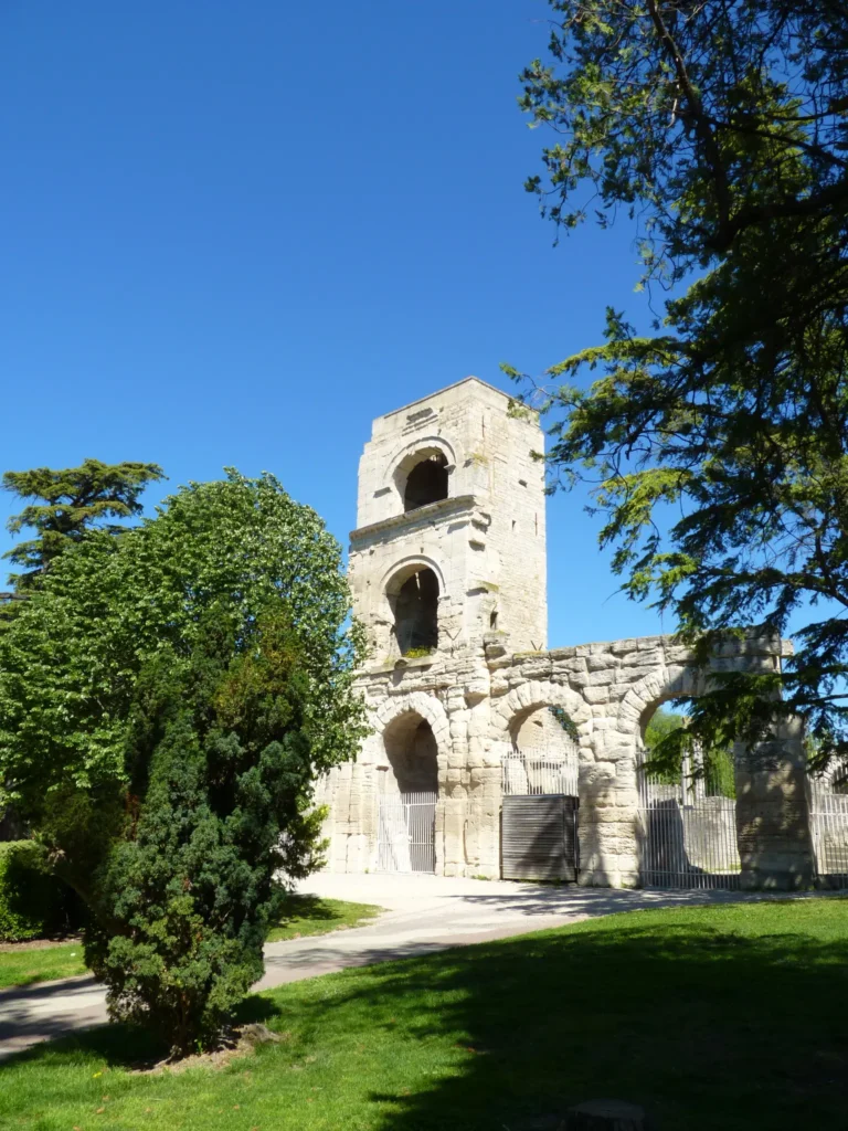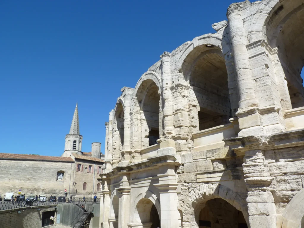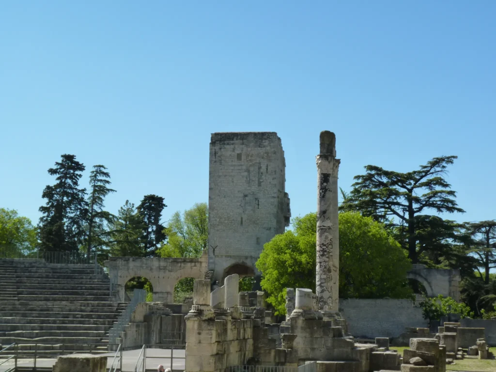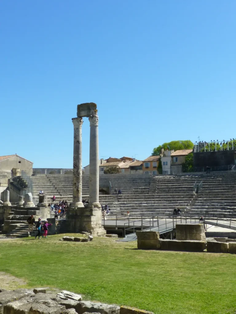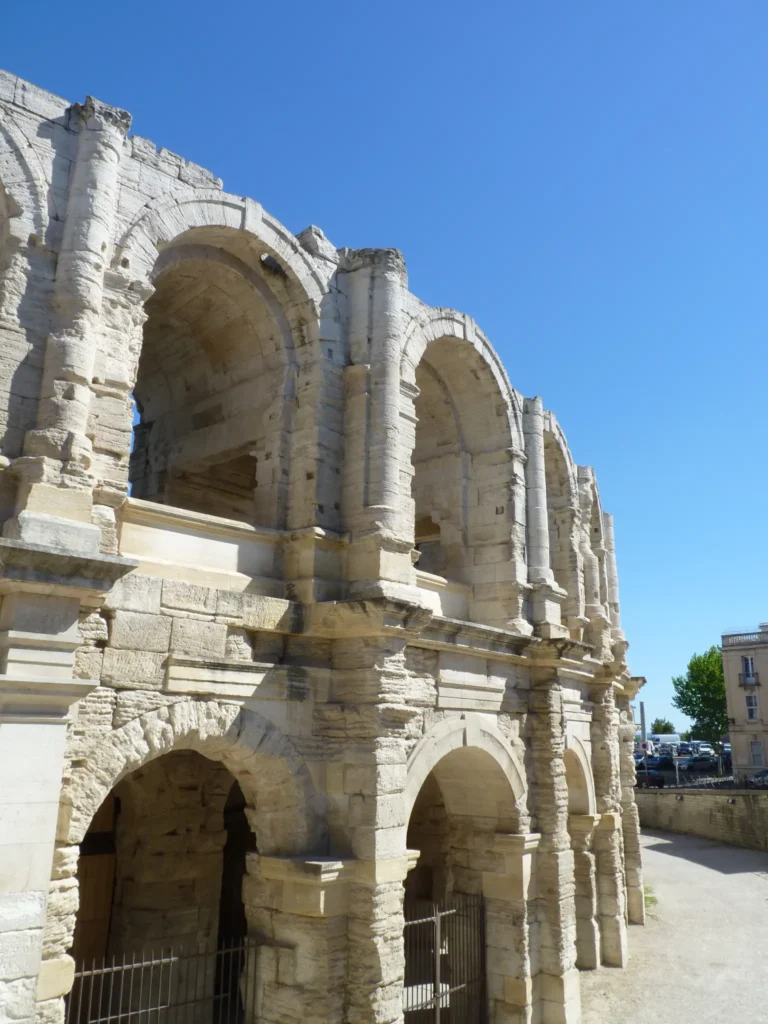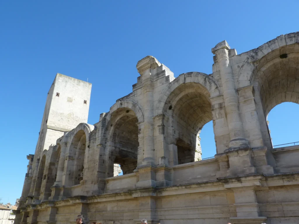 Mas o ex libris de Arles é sem dúvida o seu anfiteatro romano, construído no ano 90 a.C. e que se mantém até hoje em relativo bom estado. Depois da queda do Império Romano foi transformado em fortaleza, com casas e igrejas no seu interior, o que explica as torres de que ainda existem vestígios. Tal como a arena de Nimes, é hoje em dia usado para corridas de touros, espectáculos de música ou dança, teatro, e etc.